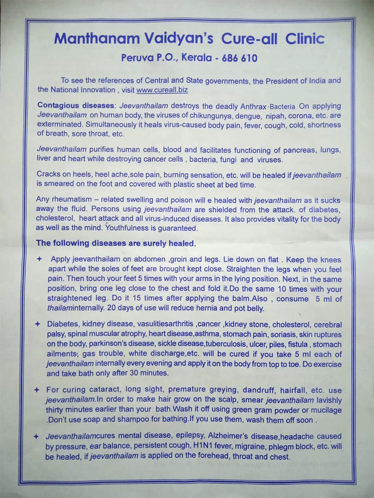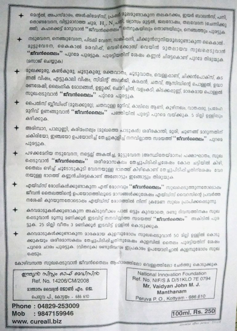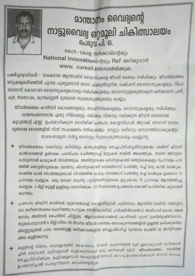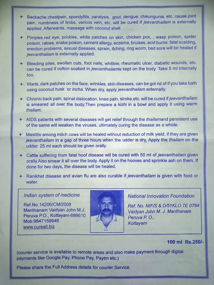 The effective remedy for many diseases, which are considered as no cure. The traditional Vaidyan John.M.J. .Manthanam presents the rare and effective mixture of medicines, at the end of the prolonged experiments and effort.